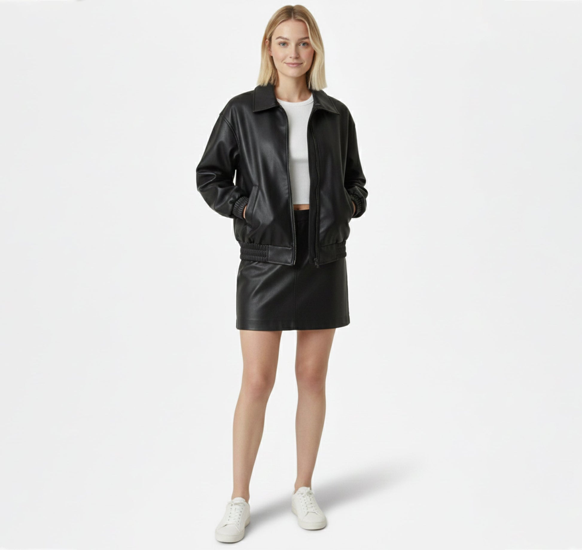 Crafted from high-quality faux-leather with a soft faux-fur blend interior, this jacket achieves the perfect balance between durability and comfort. The collage stitching adds subtle texture and visual detail, giving the jacket a refined yet urban character. Ideal for transitional weather, it pairs effortlessly with denim, dresses, boots, or athleisure wear—making it a reliable staple for both casual days and elevated streetwear looks.